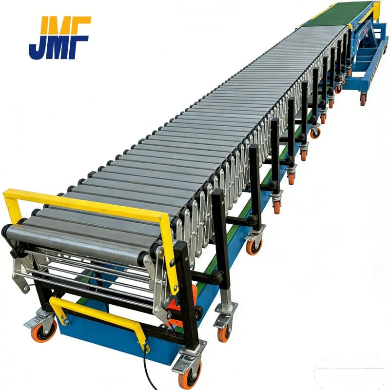 Its front end features a powered roller telescopic device, enabling automatic conveying of carton goods, saving time and effort. The height of the horizontal feeding end at the rear can be finely adjusted, making it convenient for people of different heights to place goods.